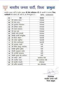 भारतीय जनता पार्टी प्रदेश अध्यक्ष हेमंत खंडेलवाल द्वारा जिला झाबुआ की कार्यकारिणी घोषित की जिसमे 21 पदाधिकारीयो की घोषणा करी बाकी के 2जिला मंत्री,मीडिया प्रभारी,आईटी प्रभारी और सोशल मीडिया प्रभारी की घोषणा होना बाकी है,कल हुई घोषणा में जिले की पूर्व भाजपा महिला मोर्चा अध्यक्ष और लोकसभा प्रभारी आरती भानपुरिया को भाजपा जिला उपाध्यक्ष बनाया है,सामजिक स्तर और राजनीतिक स्तर पर मजबूत होने के चलते भाजपा जिला संगठन को आने वाले समय मे लाभ मिलेगा।